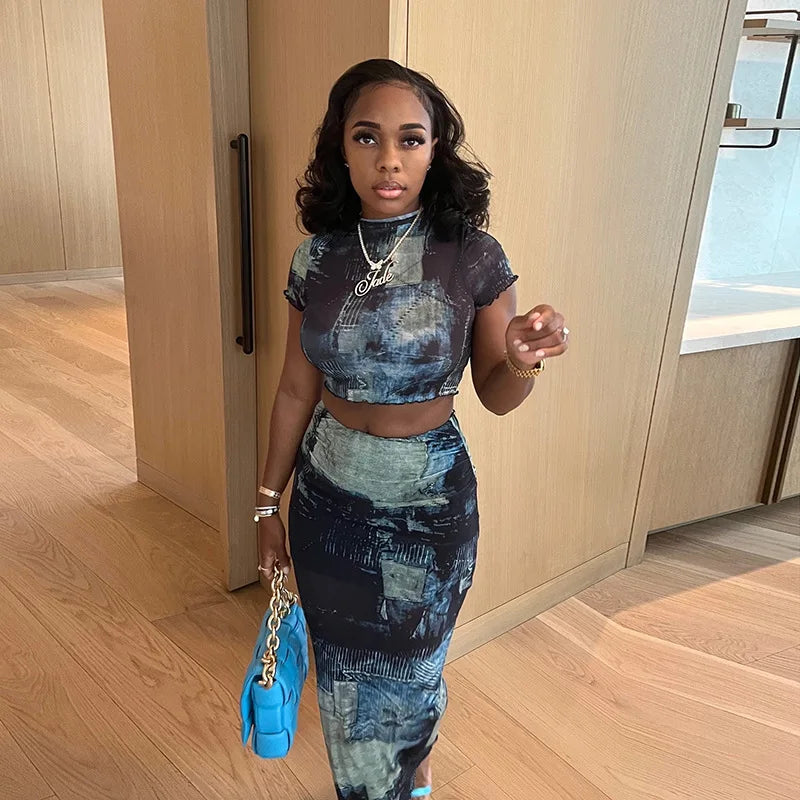 The cropped top features a fitted silhouette with subtle patchwork detailing that adds an artistic edge, while the coordinated skirt complements it beautifully with a sleek, figure-hugging design. The indigo tones and patchwork patterns give it a handcrafted, boho-inspired feel with a contemporary twist.