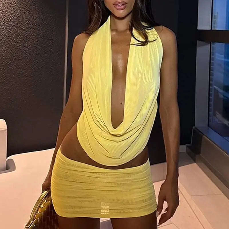 • Flirty cowl neck halter + mini skirt combo that screams party-ready